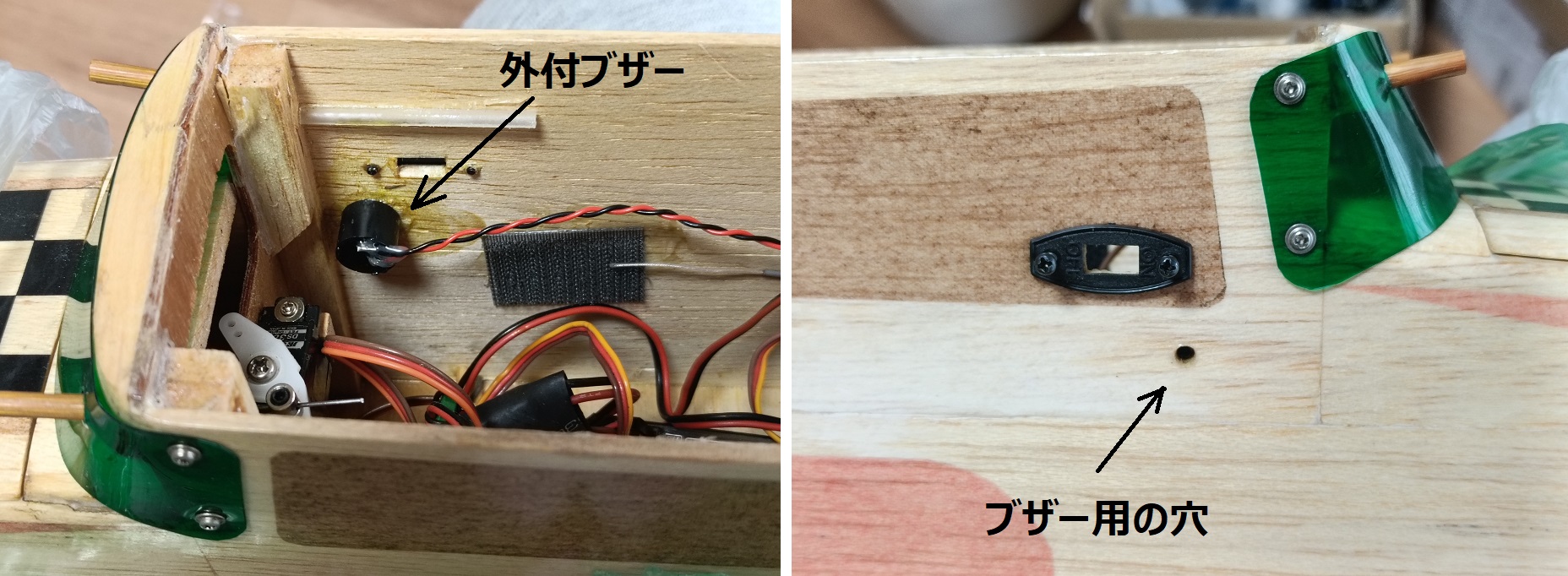 機体に搭載することで内蔵ブザーの音が機体内にこもる場合は、以下のように機体に小さな穴を開けて外付ブザーを付けるとブザー音が聞こえやすくなります。なお内蔵ブザーも同時に鳴ります。 。